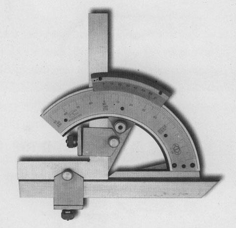 Угломер-транспортир с нониусом представляет собой пластину полукруглую со шкалой, разбитой на градусы, которая шарнирно соединяется «ласточкиным хвостом» латунными ползунками с направляющей. Приставляя угломер к детали, необходимо совместить базовую сторону детали с одним из краев направляющей линейки. Поворотом полукруглой пластины, перемещая ее по направляющей, ее совмещают с сопряженной линией детали. Угол определяется по шкале угольника.