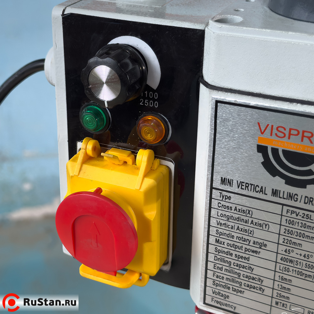 Фрезерный станок VISPROM FPV-25LP представляет собой качественный агрегат с возможностью поворота шпинделя на 45 градусов. Частотный регулятор гарантирует плавное изменение скорости вращения шпинделя для точной настройки максимально подходящего режима работы. Станок применяется на производстве для выполнения фрезеровочных и сверлильных операций. Точность сверления составляет 0.2 мм.