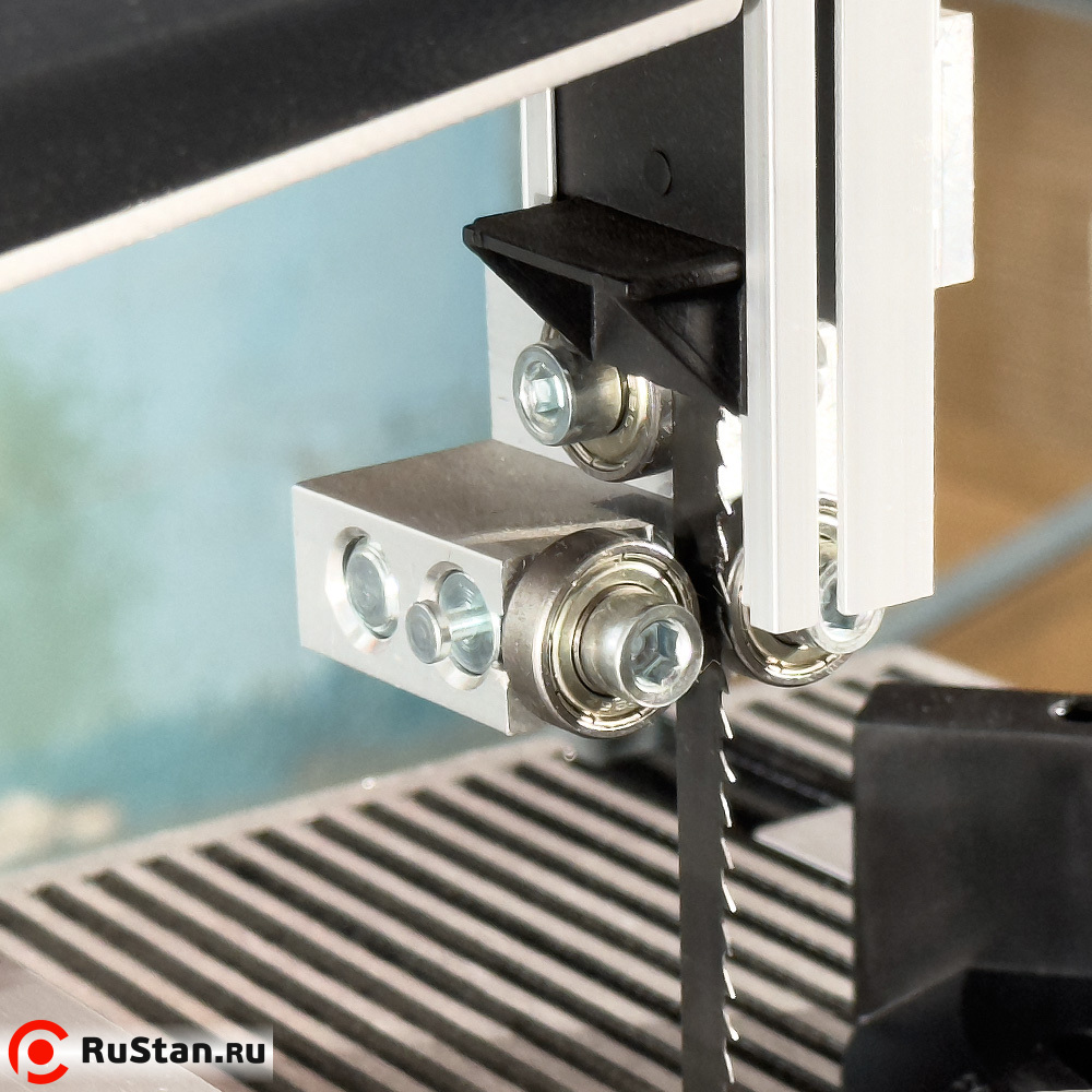 Вылет верхнего блока направляющих подшипников устанавливается в зависимости от толщины разрезаемого материала. Для получения точного и качественного среза, расстояние между верхним блоком направляющих подшипников и обрабатываемым материалом должен быть минимальным, но при этом заготовка должна свободно перемещаться на столе (рекомендуемый зазор между верхним блоком направляющих и заготовкой 3 – 5 мм)
