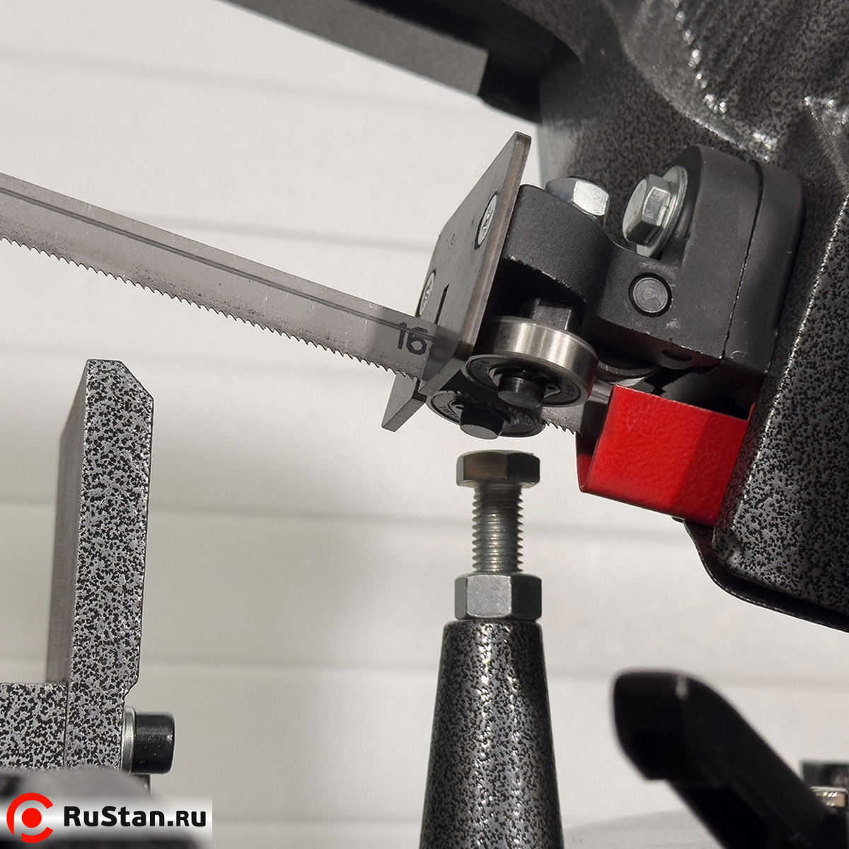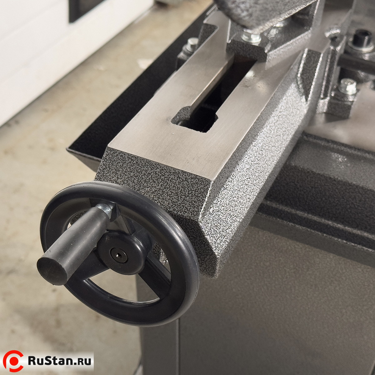 Заготовка фиксируется в регулируемых, быстрозажимных тисках. Скорость опускания пильного узла (скорость подачи) изменяется с помощью регулятора гидроцилиндра.