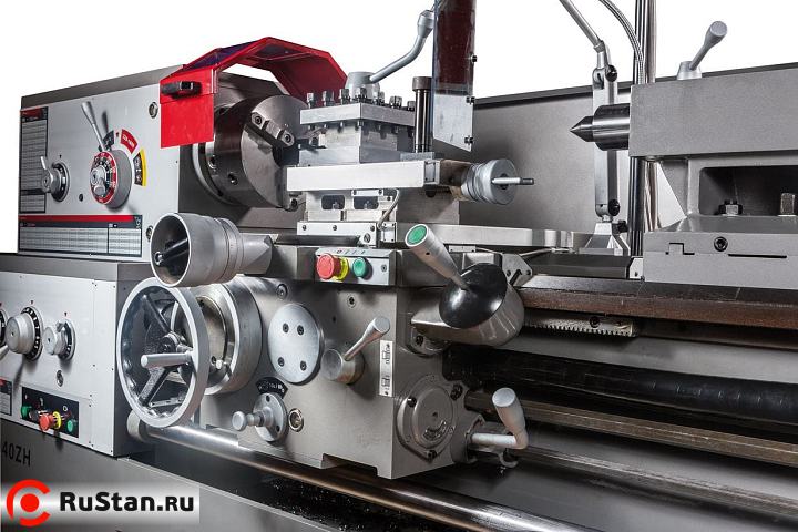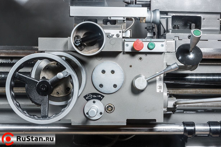 Пониженная скорость 9 об/мин выставляется при необходимости нарезания резьбы плашкой. На станке предустановлены 80 режимов продольных и поперечных подач, что позволяет нарезать метрическую, дюймовую, модульную и питчевую резьбы с повышенным уровнем точности. При этом биение на шпинделе не превышает 9 микрон. Привод шпинделя постоянно находятся в масляной ванне, что способствует охлаждению, снижает уровень шума и продлевает срок эксплуатации станка. Для уменьшения вибраций и качественного теплоотвода от инструмента и шпинделя станок установлен на массивную станину из особопрочного чугуна.