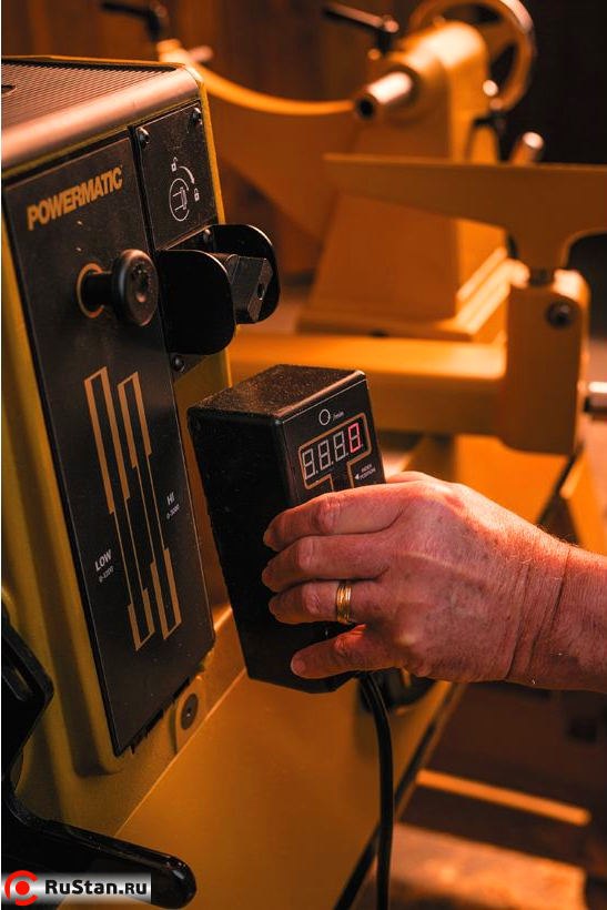 Станок подключается к однофазной сети 220В, но имеет встроенный частотный преобразователь и, соответственно, трехфазный асинхронный двигатель. Электроника позволяет в широком диапазоне изменять скорость вращения шпинделя, обеспечивая при этом одинаково высокий крутящий момент. Частота оборотов задается небольшой поворотной рукояткой и, для удобства настройки, отображается в цифровом виде на символьном дисплее. Вспомогательная функция блока – изменение направления вращения простым переключателем. Для удобства управления пульт сделан выносным с магнитной фиксацией – его можно разместить в любом месте, где это будет удобно оператору.