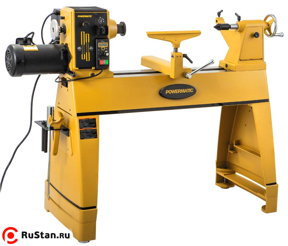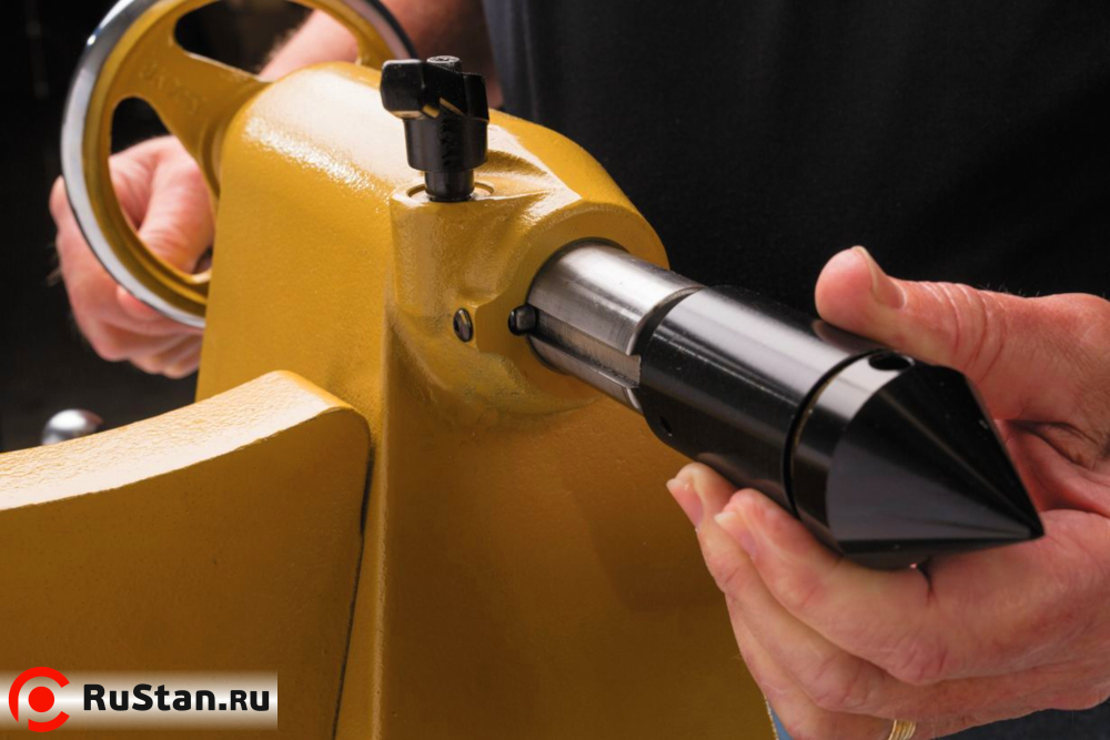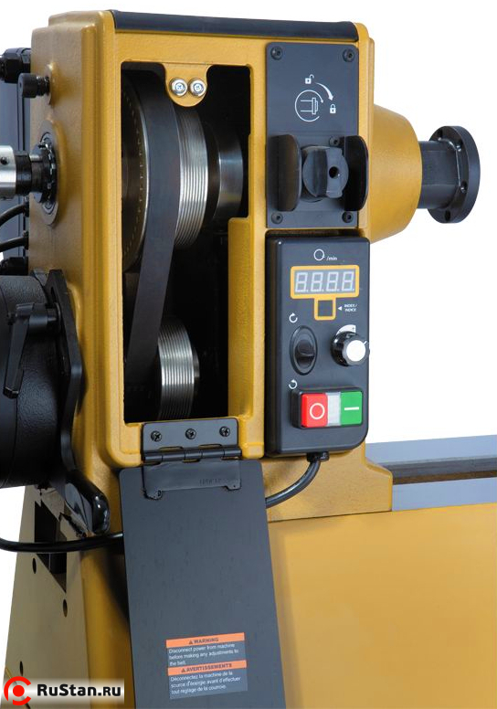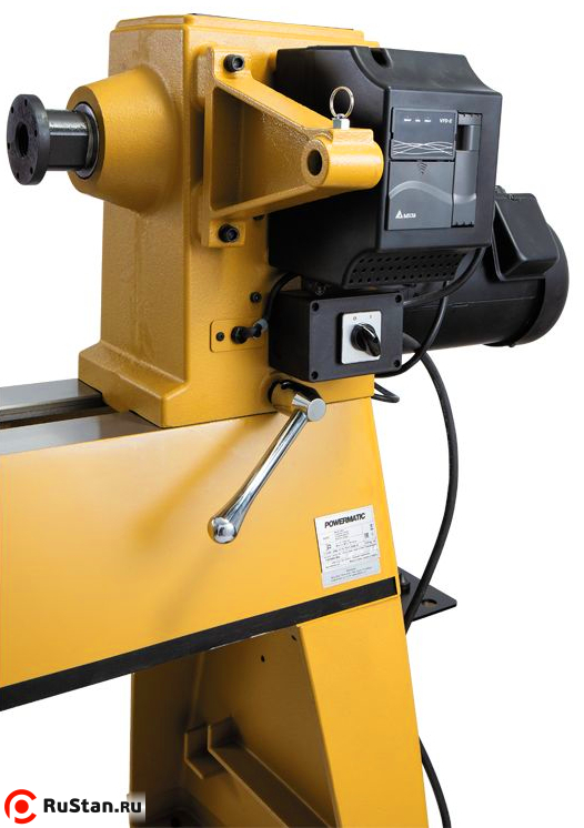 Для увеличения крутящего момента при обтачивании деталей большого диаметра можно переустановить ремень на шкивах. Натяжение производится рычагом с передней стороны бабки, который фиксируется винтовым зажимом с удобной ручкой. Есть делительное приспособление на 48 позиций и отдельный от него механизм блокировки шпинделя для удобства замены оснастки. Сама бабка подвижная вдоль станины и, кроме того, поворотная на 180° (это позволяет работать «над полом» с деталями, диаметр которых больше, чем просвет до станины). Задняя бабка с отсеком для хранения принадлежностей.